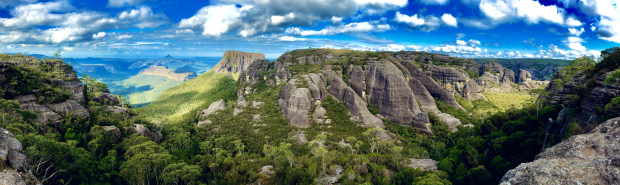 A truly breathtaking view across the Budawangs in southern NSW. Looking towards the coast with a number of prominent features in the shot including Pigeon House Mountain, Clyde River Gorge, Monolith Valley, and The Castle.