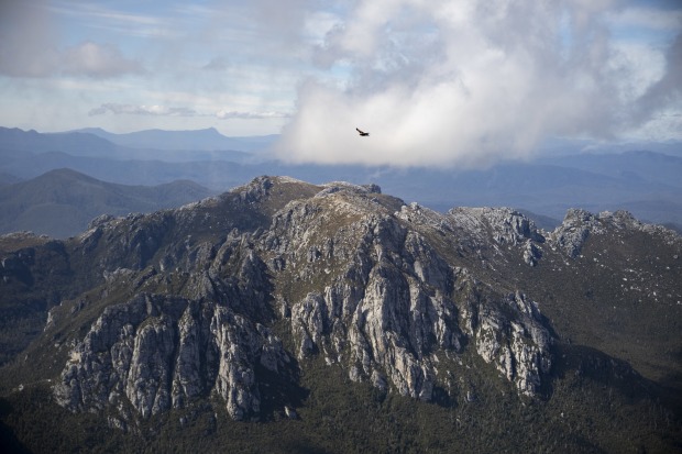 View from the summit of Frenchmans Cap, Tasmania, Australia. Sweeping views of the surrounding country also being enjoyed by a wedge - tailed eagle.