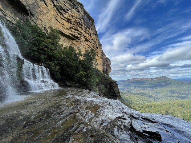 The Jamison Valley of the Blue Mountains is a large sweeping landscape of valleyys, peaks, trees and gorges. Katoomba falls is one of many waterfalls that fall into that Valley. This image is taken from the middle level of the Katoomba falls looking into the Jamison Valley.