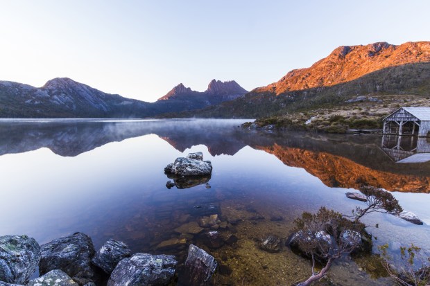 Dove Lake early morning before the wind came up and stole away the reflections.