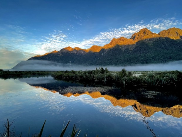Mirror Lakes sunrise. Fiordland National park. New Zealand