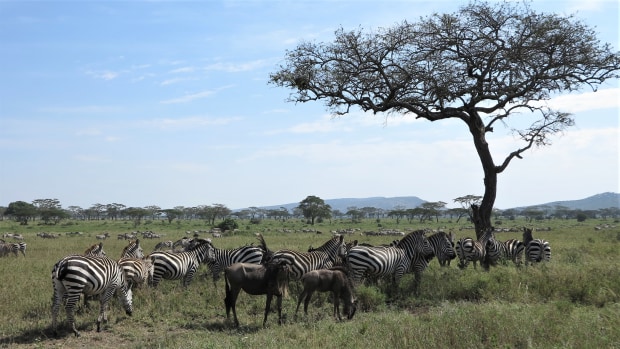 Herds of Zebra, Wildebeeste and others in the Serengeti National Park, Tanzania gathered in a typical African plains wilderness.