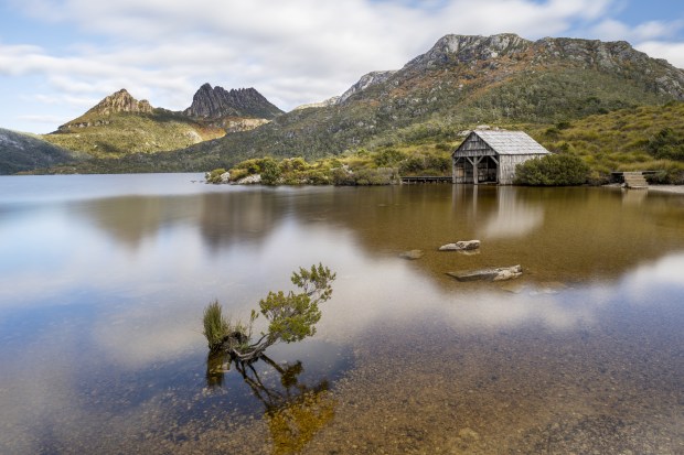 The Boathouse at Dove Lake with Cradle Mountain in the background, Tasmania