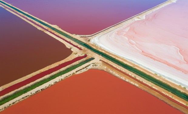Hutt Lagoon, Western Australia The stunningly vibrant red and pink hues of Hutt Lagoon are due to the extremely high levels of salinity present within the lagoon that vary in vibrancy and hue depending on the weather and the time of day.