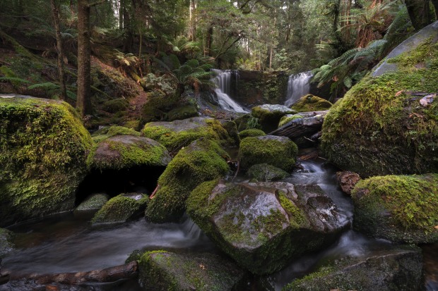 Location: Horse Shoe Falls, Mt. Field This shot was taken on a late afternoon in Aug 2020. Sun just flew behind the tree at the far back of the falls. As the result, it produced the nice orange/yellow grow all over the green moss.