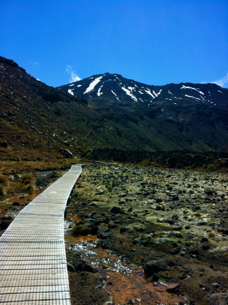 The Tongariro National Park Apline Crossing is a 19.4 km height wilderness walk that takes about 6-8 hrs to cross. The hike takes you up through volcanic lava fields, and calderas which up toward Mt Ruapheu. At the time I walked on this perfect day you could see the smoke coming off the volcano in the distance. The pathway made for much anticipation for the climb and views ahead which included walking across snowfields. Perfect day!