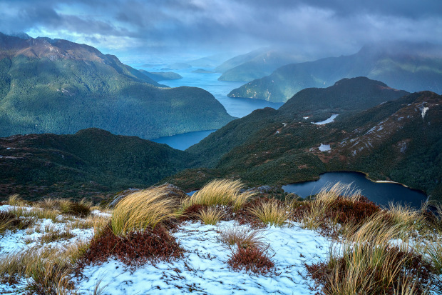 For a day exploring Fiordland you must be prepared for the unexpected. While shooting from this peak I encountered strong winds, snow and rain, moody clouds and even a guest appearance from the sun. Of course the most important thing I encountered were outstanding views, whichever way I looked.